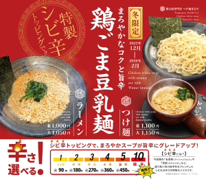 まるや冬の数量限定メニュー<12/1~2月末迄>まろやかなコクと極上の旨みが広がる冬のあったか麺。「鶏ごま豆乳つけ麺/ラーメン」を是非ご賞味ください。
